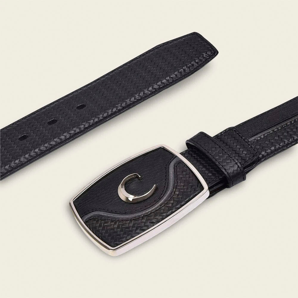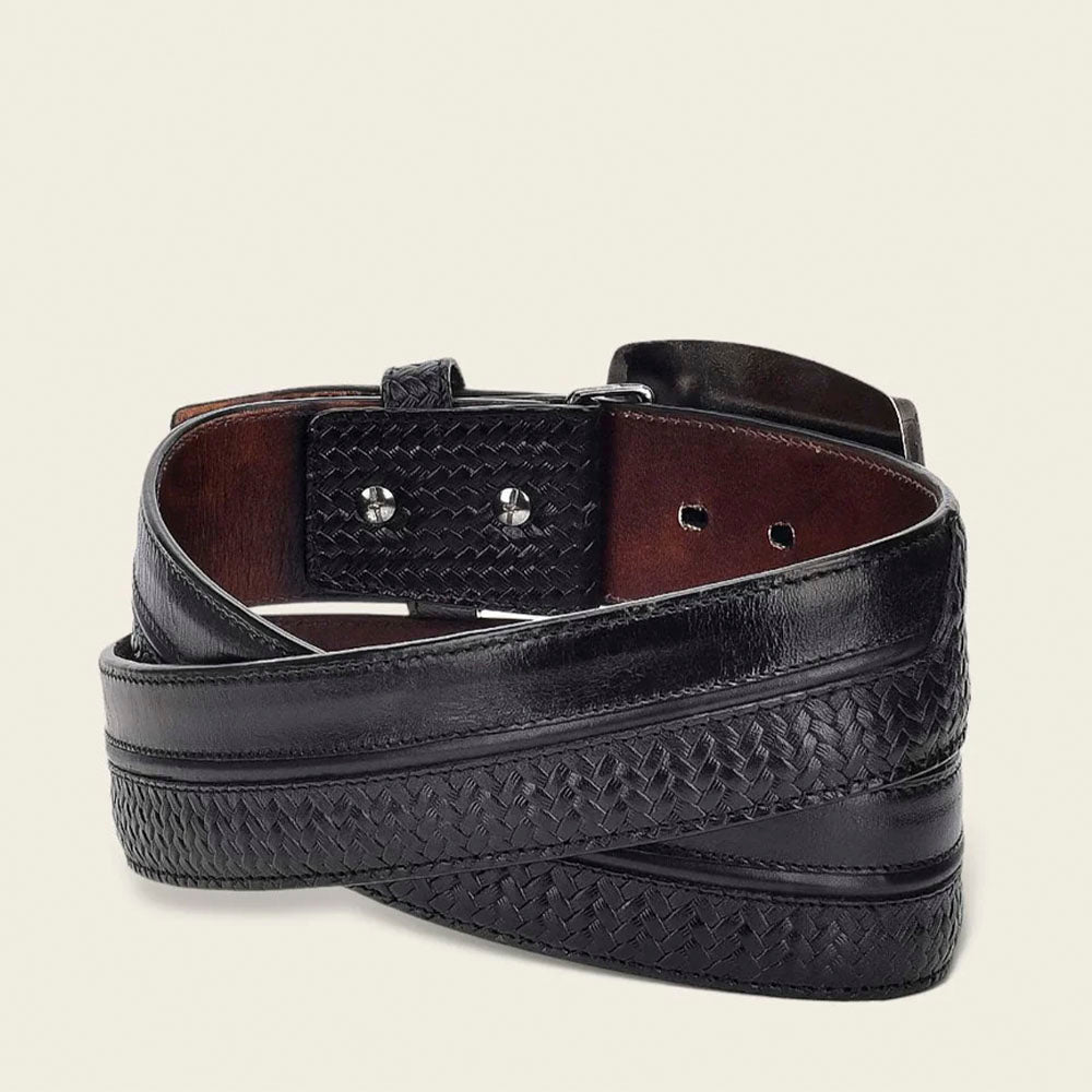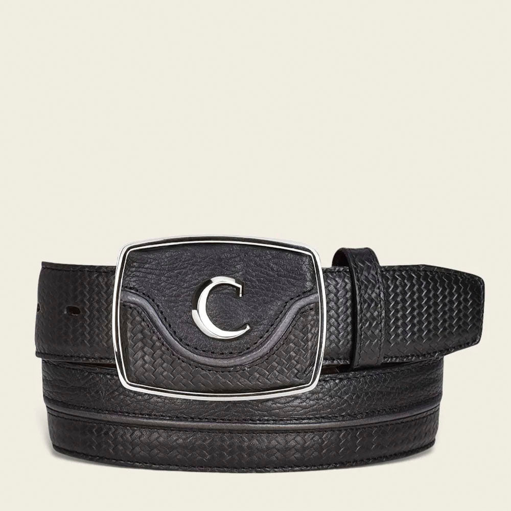 Cinturón western para hombre en piel bovina. Presenta grabados con textura entretejida. Con hebilla forrada de 45mm con aplicación metalizada. Tiene forro de piel de bovino grabado con serigrafía del logo de Cuadra.