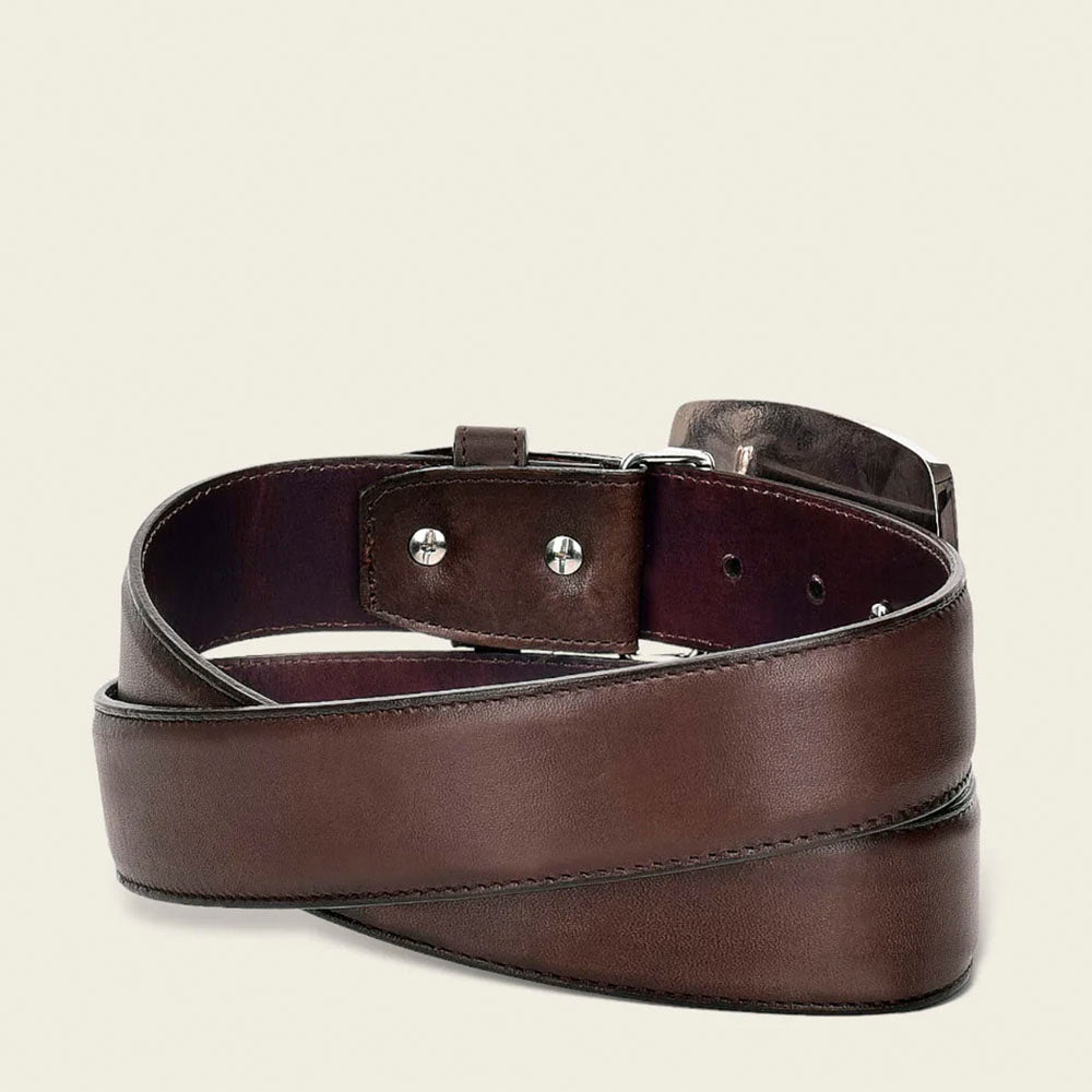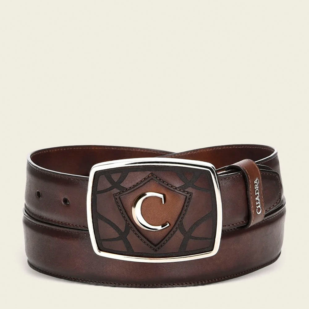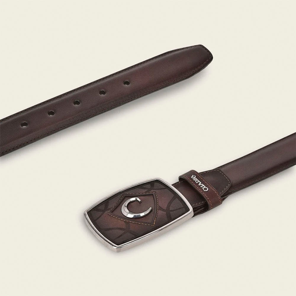 Cinturón vaquero para hombre en piel bovina. Con hebilla forrada de 38 mm con aplicación metálica y motivos orgánicos grabados a láser. Tiene forro de piel bovina grabado con serigrafía del logo de Cuadra.